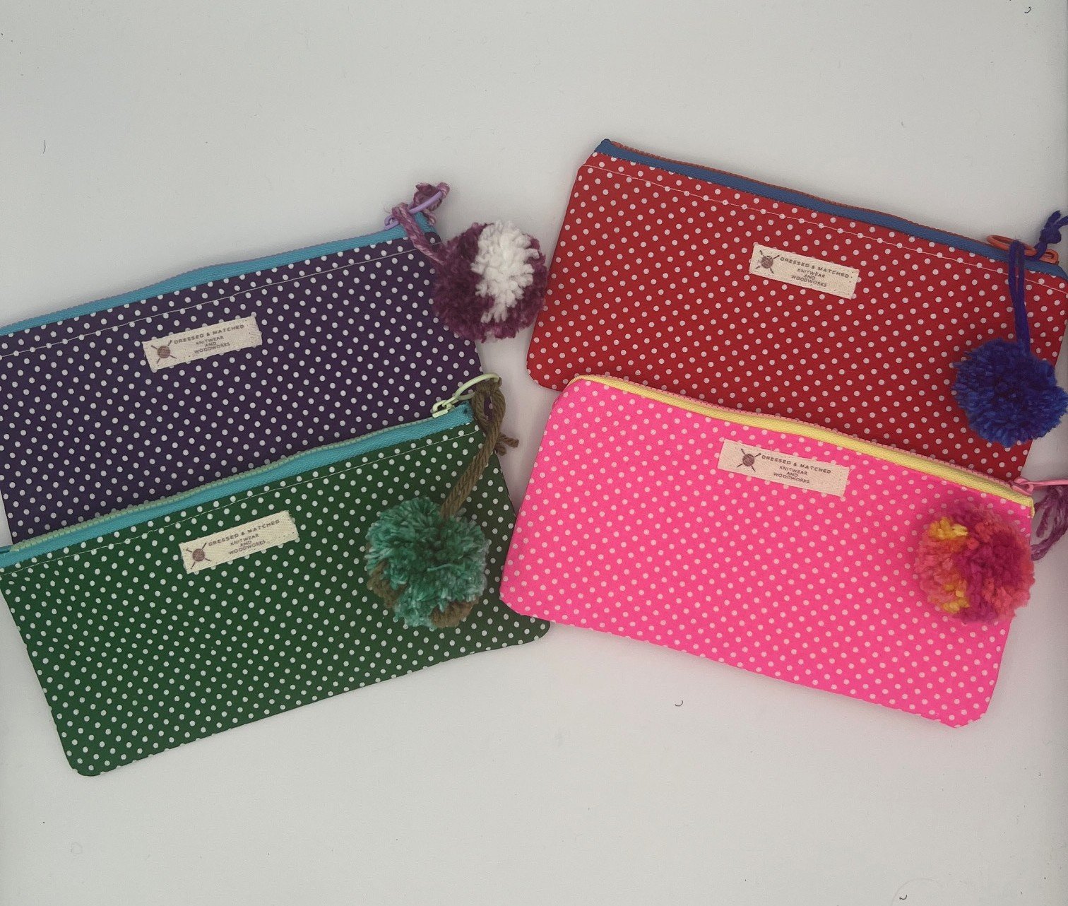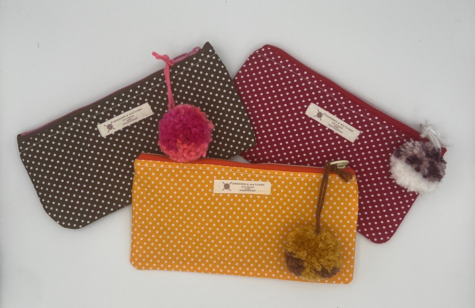 Cotton lined zipper pouch. Polka dot fabric colors correspond to the zippers, and the handmade pom poms accent the color choice. The zipper pouches measure 9" long by 5" deep. The pouch is perfect for pencils, crochet hooks, make-up, or other items you want to keep organized. Finished with an off-white Dressed and Matched Twill Label.